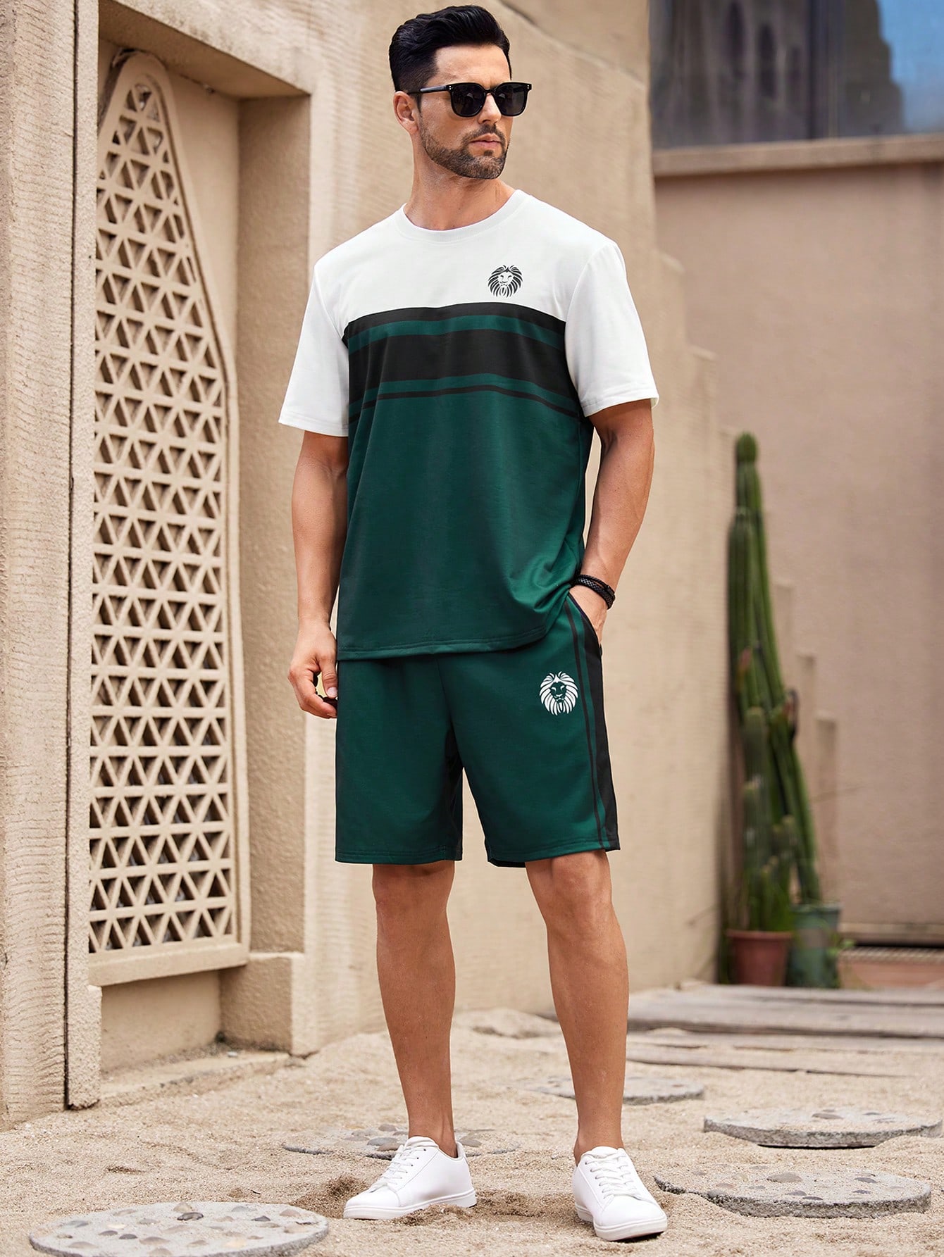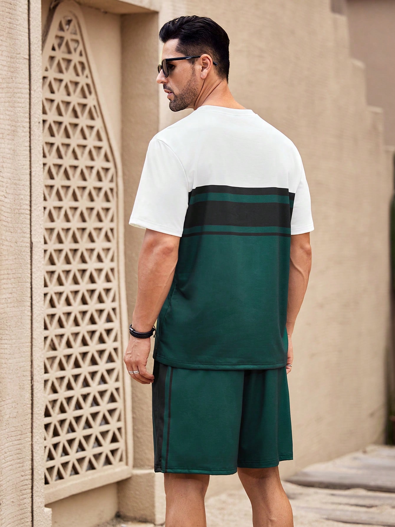 Manfinity KASUA Green & White Patchwork T-Shirt And Shorts Set
