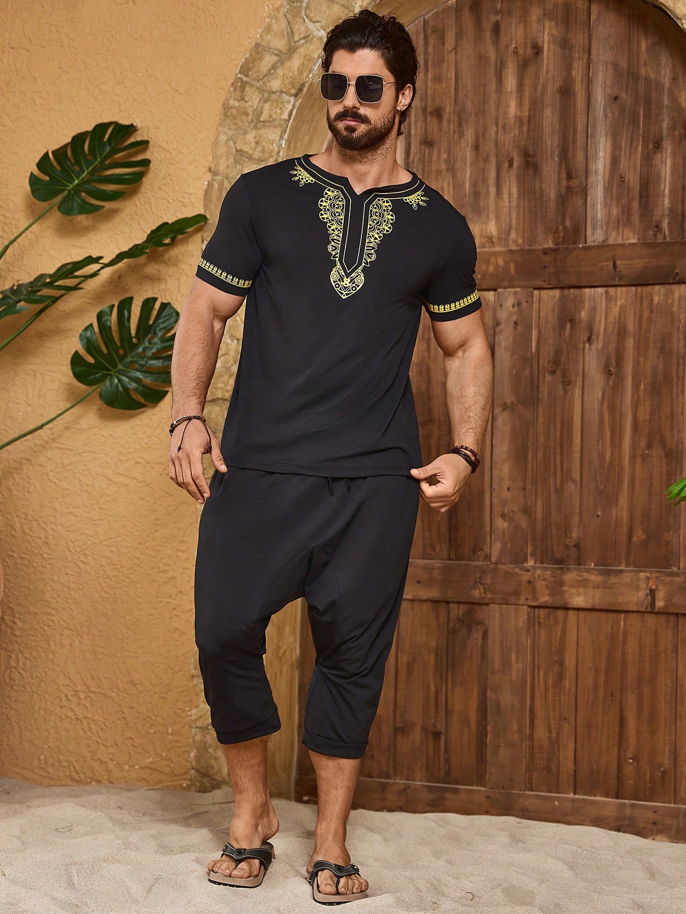 Manfinity KASUA Men’s Notched Collar Printed Short Sleeve T-Shirt And Long Pants Two-Piece Set, Going Out, Husband, Boho